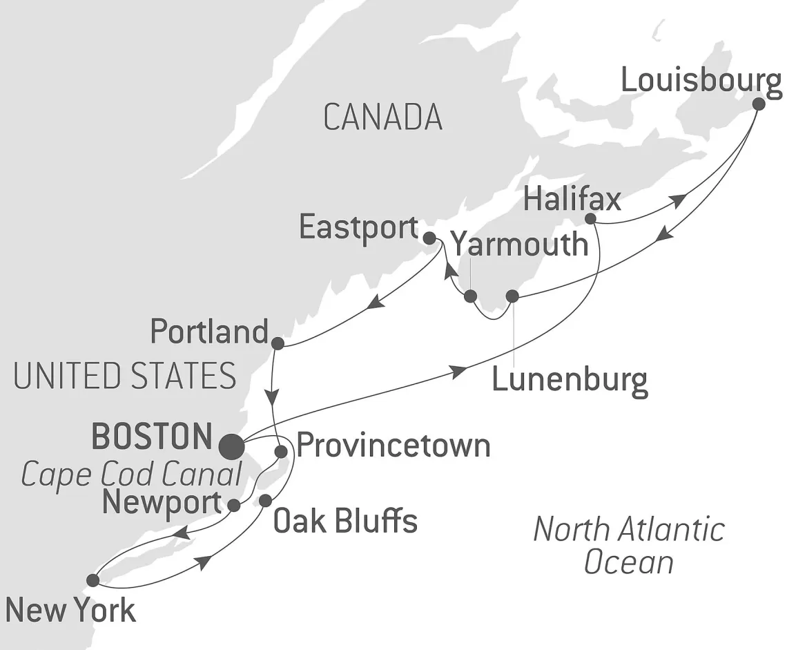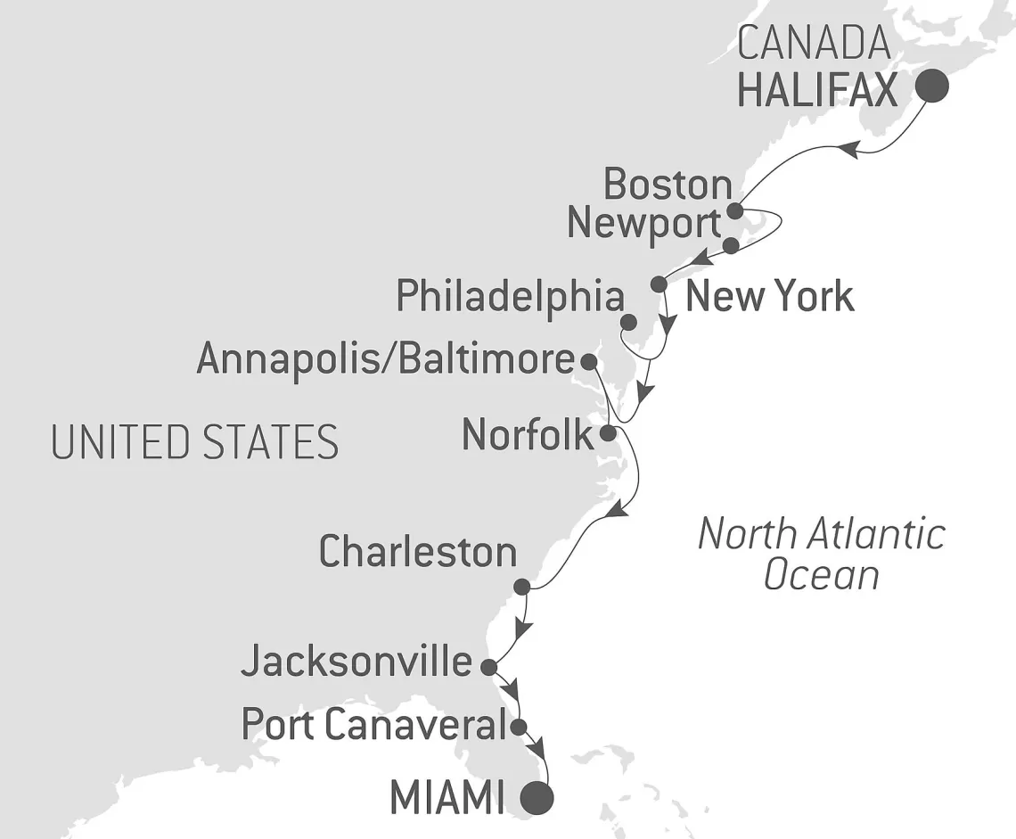 Маршрут круиза: Нью-Йорк - море - Галифакс - море - море - море - море - Понта-Делгада, о.Сан-Мигел - Понта-Делгада, о.Сан-Мигел - море - Лиссабон - море - Кадиc / Севилья - Малага - море - Марсель - Барселона - море - Ла-Гулетт - Палермо, о. Сицилия - Неаполь / Помпеи - Ливорно / Флоренция, Пиза