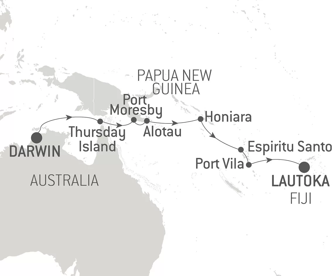 Маршрут круиза: Дарвин - море - море - о. Терсди-Айленд - море - о. Самарай - Алотау - о-ва Конфликт - море - Хониара - море - о. Эспириту-Санто - Луганвилл - Порт-Вила - Мистери-Айленд - море - Лаутока, о. Вити-Леву
