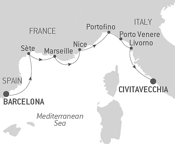 Маршрут круиза: Барселона - Марсель - Порто Черво, о. Сардиния - Портофино - Ливорно / Флоренция, Пиза - Вильфранш / Ницца - море - Барселона - Маон, о. Менорка - Альгеро, о. Сардиния - Канны - Сен-Тропе - море - Чивитавеккья / Рим - Монте-Карло
