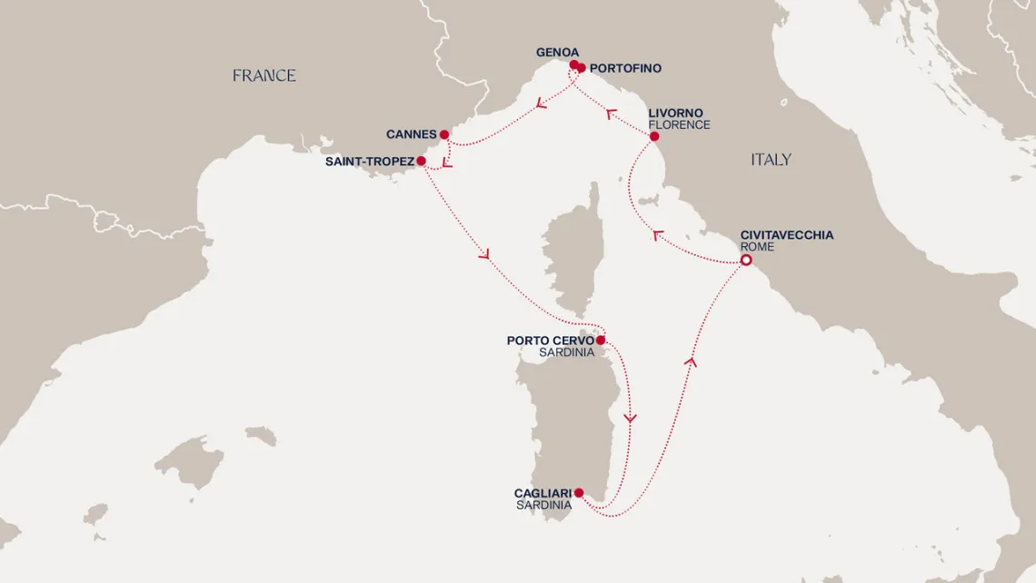 Маршрут круиза: Чивитавеккья / Рим - Генуя / Милан - Марсель - Барселона - море - Гибралтар - Касабланка - море - море - море - Минделу, о. Сан-Висенте - море - море - море - море - Сальвадор - море - Рио-де-Жанейро - Рио-де-Жанейро - море - море - Буэнос-Айрес - Буэнос-Айрес - море - море - Пуэрто-Мадрин - море - Порт-Стэнли - море - море - Ушуайя - Ушуайя - море - море - Пуэрто-Монт - море - Вальпараисо / Сантьяго - Вальпараисо / Сантьяго - море - море - море - море - Ханга-Роа, о. Пасхи - море - море - Баунти-Бэй - море - море - Папеэте, о.Таити - Папеэте, о.Таити - о. Муреа - море - Атолл Аитутаки - о. Раротонга - море - море - море - море - море - Бэй-оф-Айлендс - Окленд - Тауранга - море - Литтелтон / Крайстчерч - Данидин - Милфорд-Саунд - море - Хобарт - Хобарт - море - Сидней - Сидней - море - море - Нумеа - море - Луганвилл - море - море - море - Апиа, о. Уполу - Паго-Паго, о. Тутуила - море - море - море - море - море - Гонолулу, о. Оаху - Хило, о. Биг-Айленд - море - море - море - море - море - Лос-Анджелес - море - море - Кабо-Сан-Лукас - море - море - море - Пунтаренас - Панамский канал - море - Панамский канал - море - Очо-Риос - море - море - Род-Таун, о. Тортола - Филипсбург, о. Синт-Мартен - море - море - море - море - море - море - Лас-Пальмас, о. Гран-Канария - море - море - о. Майорка - море - Неаполь / Помпеи - Чивитавеккья / Рим