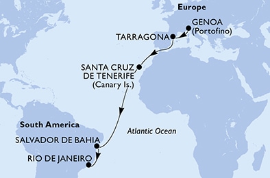 Маршрут круиза: Генуя / Милан - Чивитавеккья / Рим - Аяччо, о. Корсика - Марсель - Барселона - море - море - Пуэрто-дель-Росарио, о. Фуэртевентура - Санта-Крус-де-Тенерифе, о. Тенерифе - море - море - море - море - море - море - Филипсбург, о. Синт-Мартен - Бастер, о. Сент-Китс - Кингстаун, о. Сент-Винсент - Бриджтаун, о. Барбадос - Сент-Джорджес, о. Гренада - море - Фор-де-Франс, о. Мартиника