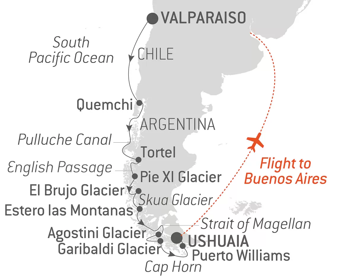 Маршрут круиза: Вальпараисо / Сантьяго - море - море - Кемчи, о. Чилоэ - канал Пулуче - Тортель - Ледник Пио XI - ледник Эль-Брухо - Ледник Амалия и канал Сармиенто - фьорды Монтаньяс - Магелланов пролив - Альберто де Агостини национальный парк - Ислас Туккерс - Ледник Гарибальди - мыс Горн - Пуэрто-Уильямс - Ушуайя