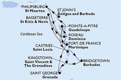 Маршрут круиза: Фор-де-Франс, о. Мартиника - Пуант-а-Питр, о. Гваделупа - Сент-Джонс, о.Антигуа - Филипсбург, о. Синт-Мартен - море - Бастер, о. Сент-Китс - Розо, о. Доминика - Фор-де-Франс, о. Мартиника - Пуант-а-Питр, о. Гваделупа - Кастри, о. Сент-Люсия - Бриджтаун, о. Барбадос - море - Кингстаун, о. Сент-Винсент - Сент-Джорджес, о. Гренада - Фор-де-Франс, о. Мартиника