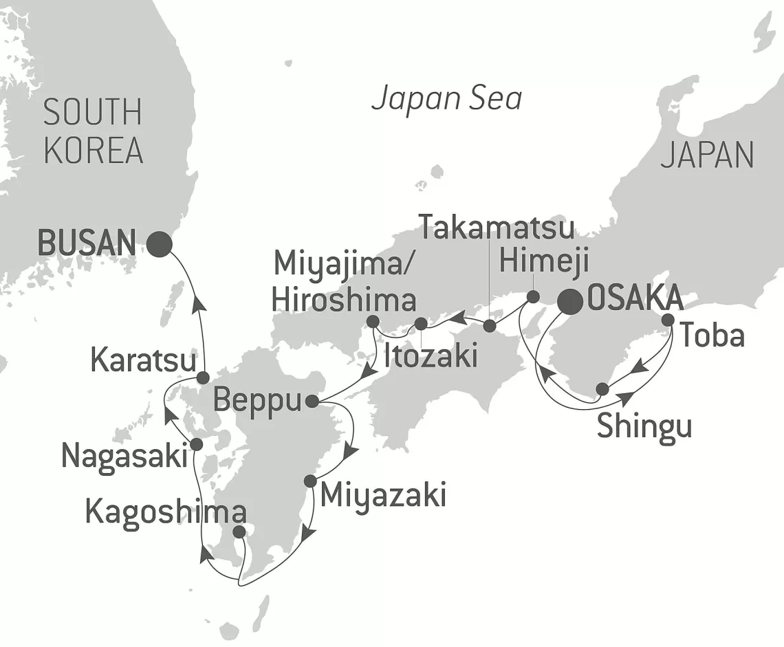 Маршрут круиза: Осака - Тоба - Сингу - Химэдзи - Такамацу - Ономити - Хиросима - о. Ицукусима - Беппу - Миядзаки - Кагосима - Нагасаки - Карацу - Пусан