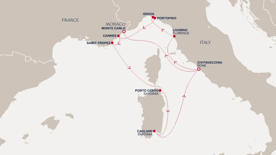 Маршрут круиза: Чивитавеккья / Рим - Ливорно / Флоренция, Пиза - Генуя / Милан - Портофино - Канны - Сен-Тропе - Порто Черво, о. Сардиния - Кальяри, о. Сардиния - море - Чивитавеккья / Рим - Монте-Карло