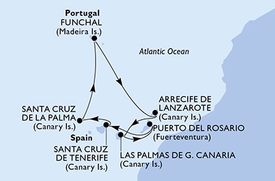 Маршрут круиза: Фуншал, о. Мадейра - Аресифи, о. Лансароте - Аресифи, о. Лансароте - море - Лас-Пальмас, о. Гран-Канария - Санта-Крус-де-ла-Пальма, о. Ла-Пальма - Санта-Крус-де-Тенерифе, о. Тенерифе - Пуэрто-дель-Росарио, о. Фуэртевентура - Фуншал, о. Мадейра