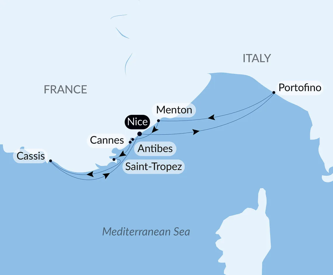Маршрут круиза: Ницца - Портофино - Ментона - Антиб - Канны - Сен-Тропе - Кассис - Ницца