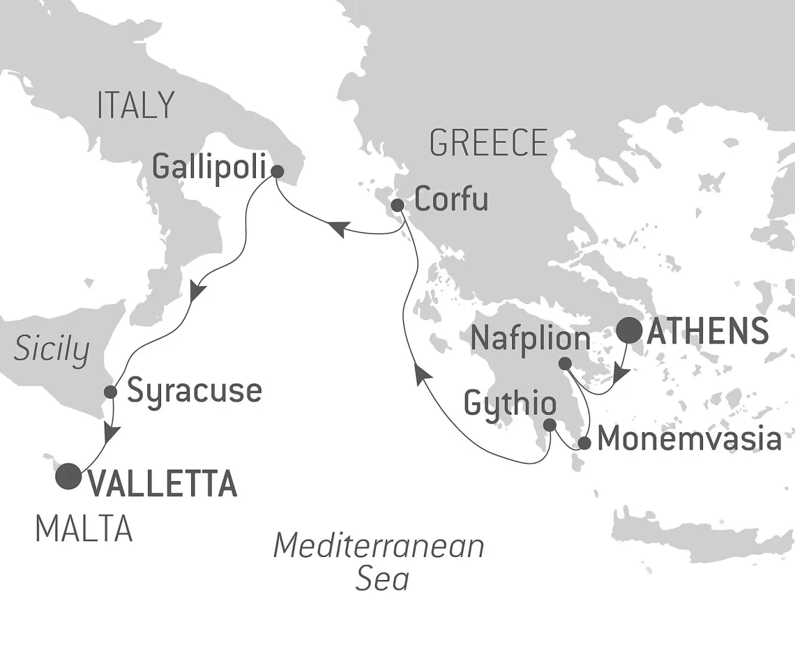 Маршрут круиза: Пирей / Афины - о. Милос - Ираклион, о.Крит - море - Джардини-Наксос, о. Сицилия - Валлетта - Ла-Гулетт - море - о. Ибица - Барселона - море - Кадиc / Севилья - Танжер - Мотриль - Картахена - море - Сен-Тропе - Монте-Карло - Ливорно / Флоренция, Пиза - Чивитавеккья / Рим