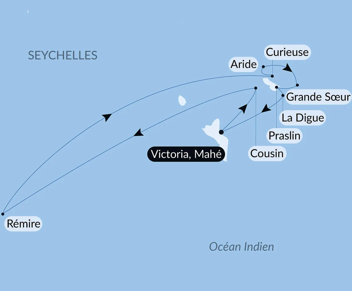 Маршрут круиза: о. Праслен - Виктория, о. Маэ - о. Праслен - о. Арид - о. Праслен - остров Ремир - о. Кузин - о. Кюрьёз - о. Кюрьёз - о. Гранд Сёр - о. Гранд Сёр - о. Ла-Диг - о. Ла-Диг - Виктория, о. Маэ - Виктория, о. Маэ
