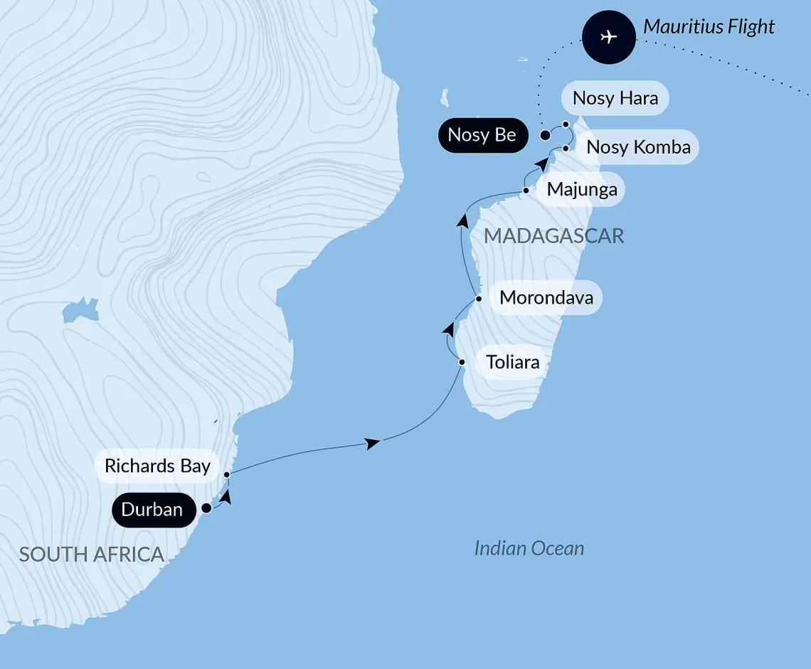 • Flight Nosy Be/Mauritius selected by PONANT in economy class.