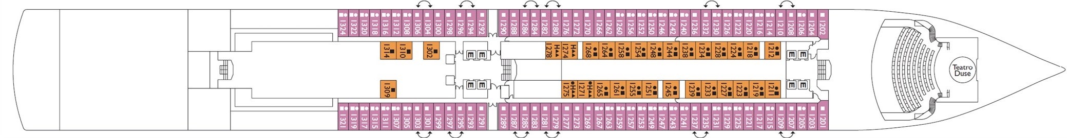 Большие панорамные окна со стеклянными дверями, которые ведут на просторный частный балкон, две односпальные кровати, большинство из которых можно преобразовать в двуспальную кроват, встроенный шкаф, ванная комната с ванной и душем, а также расширенная гостиная зона с рабочим столом, туалетным столиком и диваном. Каждая каюта также имеет свой собственный интерактивный телевизор со спутниковой антенной, индивидуальный кондиционер, телефон с прямым набором номера, фен, мини-бар, индивидуальный сейф.