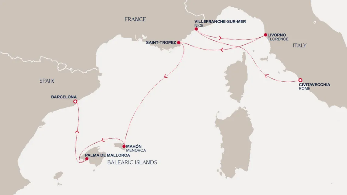 Маршрут круиза: Барселона - море - Порто Черво, о. Сардиния - Аяччо, о. Корсика - Сен-Тропе - Портофино - Ливорно / Флоренция, Пиза - Чивитавеккья / Рим - Неаполь / Помпеи - о. Капри - о. Капри - Кальви, о. Корсика - Вильфранш / Ницца - Марсель - Маон, о. Менорка - Барселона