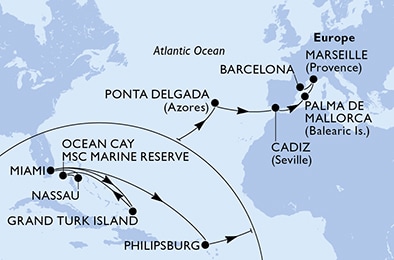 Маршрут круиза: Бриджтаун, о. Барбадос - Сент-Джорджес, о. Гренада - Кастри, о. Сент-Люсия - Фор-де-Франс, о. Мартиника - Густавия, о. Сен-Бартельми - Густавия, о. Сен-Бартельми - о. Верджин-Горда - море - море - Майами - море - море - о. Сент-Джон - Сент-Джонс, о.Антигуа - о. Тер-де-О, Гваделупа - Род-Таун, о. Тортола - Сан-Хуан