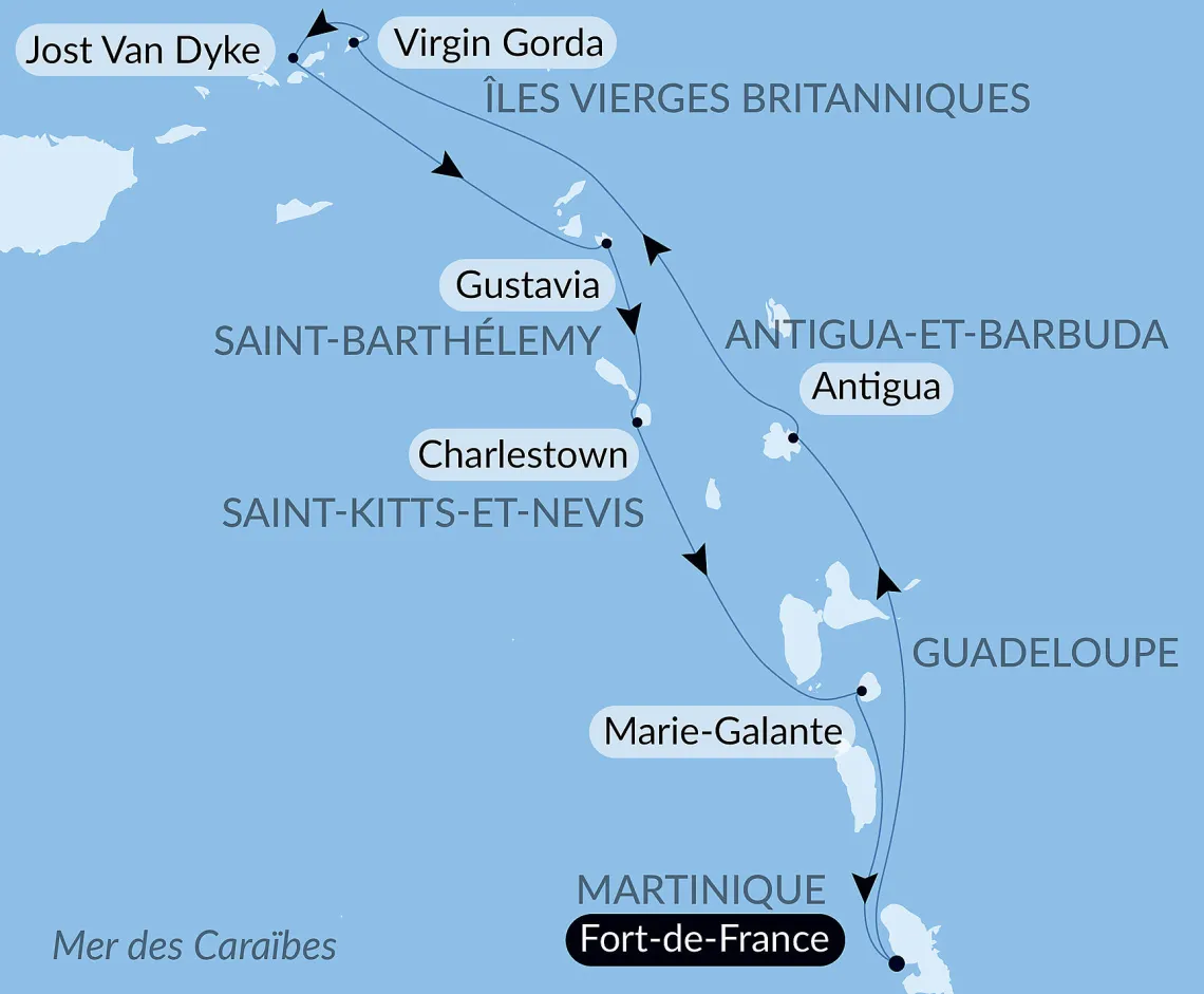 Маршрут круиза: Пуант-а-Питр, о. Гваделупа - о. Ле-Сент, Гваделупа - Фалмут, о.Антигуа - о. Барбуда - Густавия, о. Сен-Бартельми - Чарлстаун, о. Невис - о. Прикли Пэр Кейс - Роуд Бэй, о. Ангилья - море - Мариго, о. Сен-Мартен