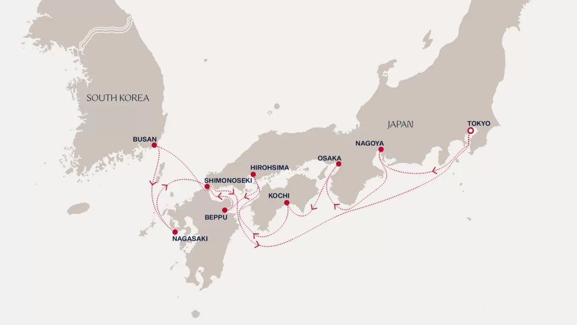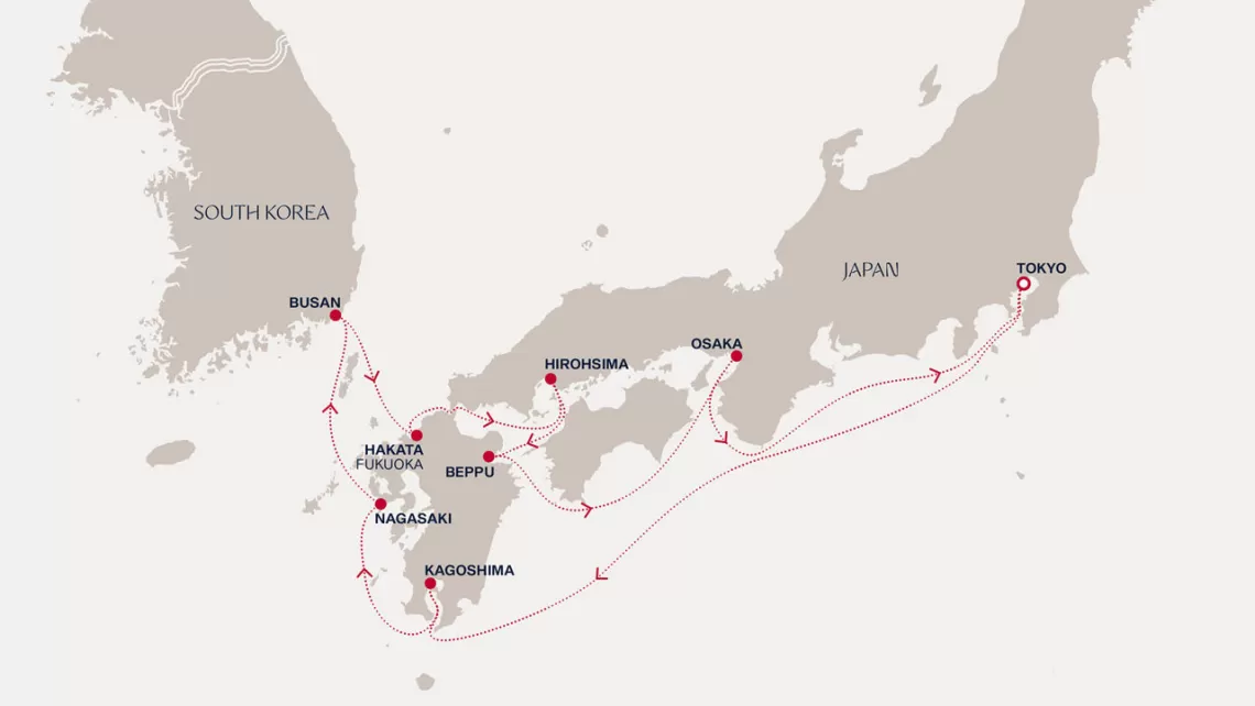 Маршрут круиза: Пусан - Пусан - Сакаиминато - Хаги - Модзи - пролив Канмон - Беппу - о. Ицукусима - Хиросима - Тамано - Осака