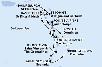 Маршрут круиза: Генуя / Милан - Марсель - Барселона - море - море - Фуншал, о. Мадейра - море - море - море - море - море - Бриджтаун, о. Барбадос - Сент-Джорджес, о. Гренада - море - Виллемстад, о. Кюрасао - море - Картахена - море - Лимон - Панамский канал - Панамский канал - море - Пунтаренас - море - Пуэрто-Кетсаль - море - море - Пуэрто Вальярта - Кабо-Сан-Лукас - море - Сан-Диего - море - Лос-Анджелес - Лос-Анджелес - море - море - море - море - Хило, о. Биг-Айленд - море - море - море - море - море - Паго-Паго, о. Тутуила - море - Апиа, о. Уполу - море - Сува, о. Вити-Леву - море - море - Окленд - Окленд - море - Веллингтон - море - море - море - Сидней - Сидней - море - море - море - Таунсвилл - Таунсвилл - Кэрнс - Кэрнс - море - море - море - море - море - Манила, о. Лусон - Манила, о. Лусон - море - Цзилун - Исигаки, о-ва Сакисима - Наха - море - море - Токио - Токио - море - Нагасаки - Пусан - море - Шанхай - море - море - Гонконг - море - Дананг - море - море - Сингапур - Порт-Кланг - Пенанг - море - море - море - море - море - море - Виктория, о. Маэ - море - море - Порт-Луи - Порт-Луи - Ля Посьон - море - море - море - море - море - Кейптаун - Кейптаун - море - море - Уолфиш-Бэй - море - море - море - море - море - море - море - Минделу, о. Сан-Висенте - море - море - море - море - море - Чивитавеккья / Рим - Ливорно / Флоренция, Пиза - Генуя / Милан