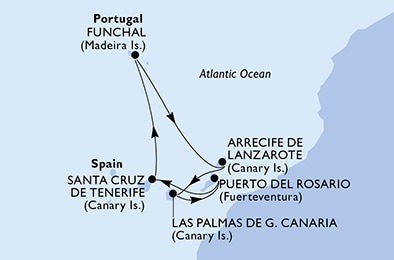 Маршрут круиза: Генуя / Милан - Чивитавеккья / Рим - Аяччо, о. Корсика - Марсель - Барселона - море - море - Пуэрто-дель-Росарио, о. Фуэртевентура - Санта-Крус-де-Тенерифе, о. Тенерифе - море - море - море - море - море - море - Филипсбург, о. Синт-Мартен - Бастер, о. Сент-Китс - Кингстаун, о. Сент-Винсент - Бриджтаун, о. Барбадос - Сент-Джорджес, о. Гренада - море - Фор-де-Франс, о. Мартиника