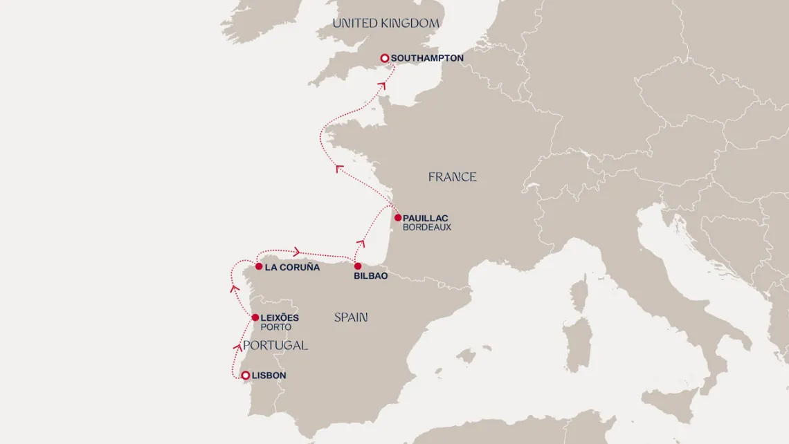 Маршрут круиза: Лиссабон - Лейшойнш - Ла-Корунья - Бильбао - Пойяк - Сен-Жан-де-Люз - море - Саутгемптон / Лондон