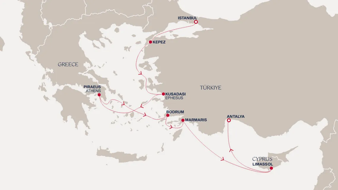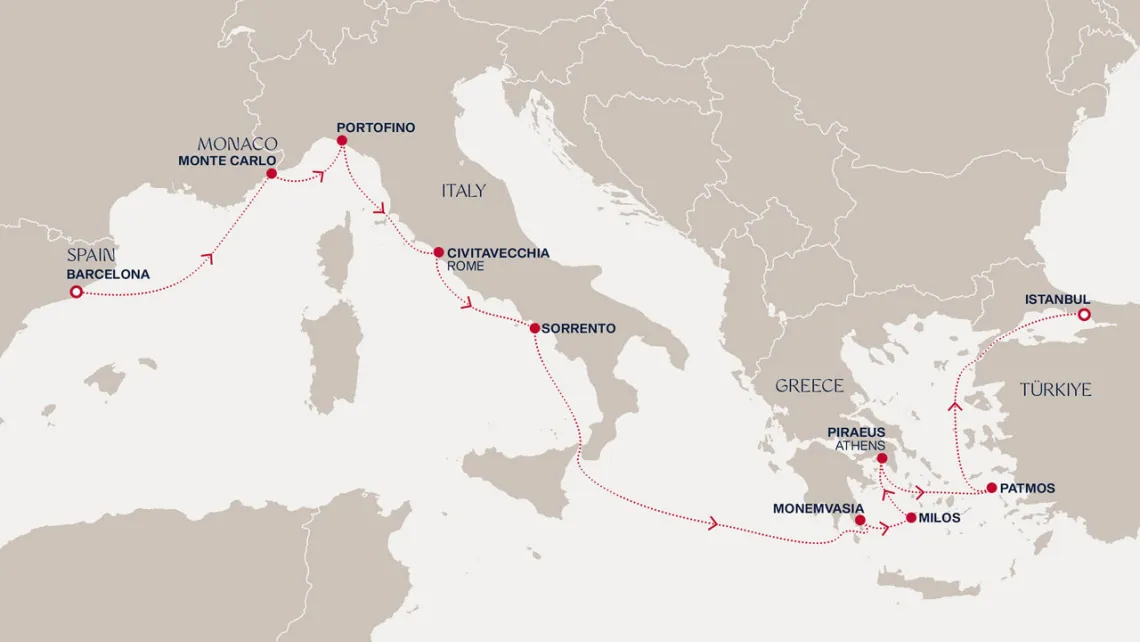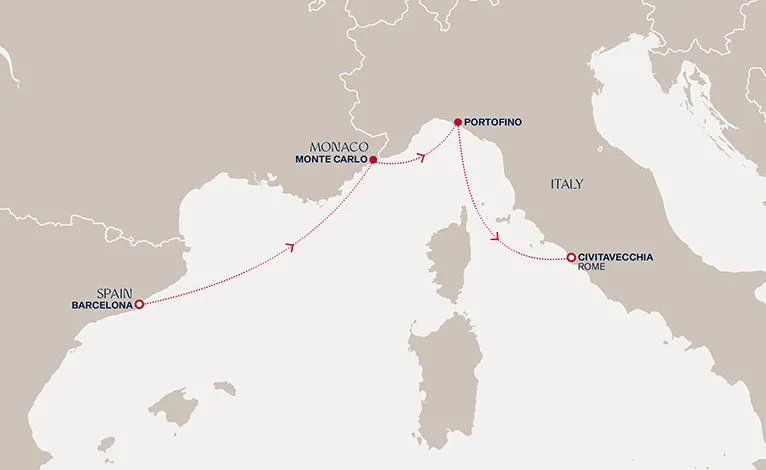 Маршрут круиза: Барселона - море - море - Санта-Крус-де-Тенерифе, о. Тенерифе - море - море - море - море - море - море - о. Гранд-Терк - море - о. Оушен Кей - море - Косумель - море - Лимон - Панамский канал - Панамский канал - море - Манта - море - Кальяо / Лима - Кальяо / Лима - море - Арика - море - море - море - море - море - Ханга-Роа, о. Пасхи - море - море - Баунти-Бэй - море - море - Папеэте, о.Таити - Папеэте, о.Таити - море - море - море - море - Нукуалофа, о. Тонгатапу - море - море - Нумеа - море - море - Окленд - Тауранга - Нейпир - Пиктон - Веллингтон - море - море - море - Сидней - Сидней - море - море - море - море - Кэрнс - Кэрнс - Кэрнс - Кэрнс - Кэрнс - Кэрнс - море - море - море - море - о. Ломбок - Беноа, о. Бали - море - море - море - Хошимин - море - море - Халонг Бэй / Ханой - Халонг Бэй / Ханой - Чан Мэй - море - море - Лаем Чабанг / Бангкок - море - Сиануквиль - море - море - Сингапур - Порт-Кланг - море - море - море - Коломбо - Кочин - море - Мумбаи (быв. Бомбей) - Мумбаи (быв. Бомбей) - море - море - море - Дубай - Дубай - Маскат - море - море - море - море - море - Акаба - Суэцкий Канал - Суэцкий Канал - Александрия - море - море - Чивитавеккья / Рим - Генуя / Милан - Марсель - Барселона