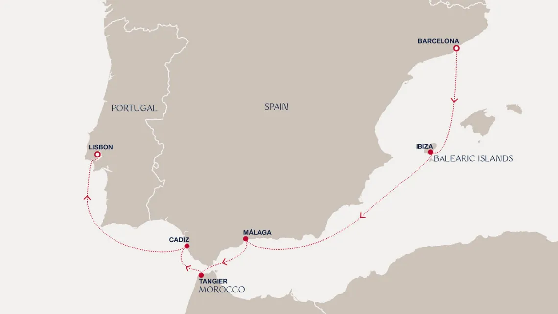 Маршрут круиза: Барселона - Пальма-де-Майорка - море - Пуэрто-Банус - Танжер - Кадиc / Севилья - Портиман - Лиссабон - Лейшойнш - Ла-Корунья - Бильбао - Пойяк - Сен-Жан-де-Люз - море - Саутгемптон / Лондон